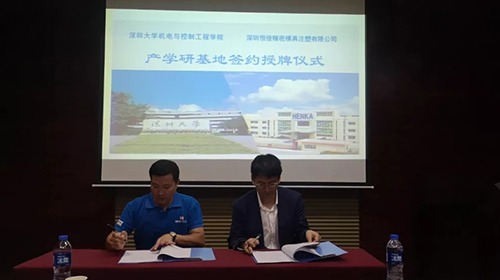 恒佳模具代表黃總、深圳大學(xué)機電與控制工程學(xué)院代表潘教授,共同簽署合作協(xié)議書