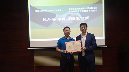 深圳大學(xué)機電與控制工程學(xué)院潘副院長代表深圳大學(xué)聘請黃俊南先生為恒佳研究生培育基地校外導(dǎo)師,受聘儀式