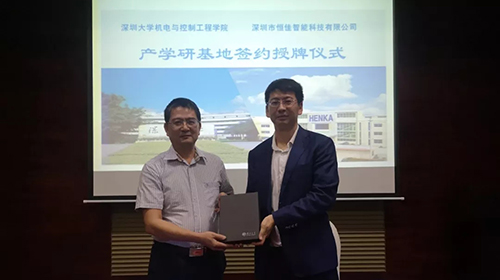 恒佳智能代表陳總、深圳大學(xué)機電與控制工程學(xué)院代表潘教授,共同簽署合作協(xié)議書